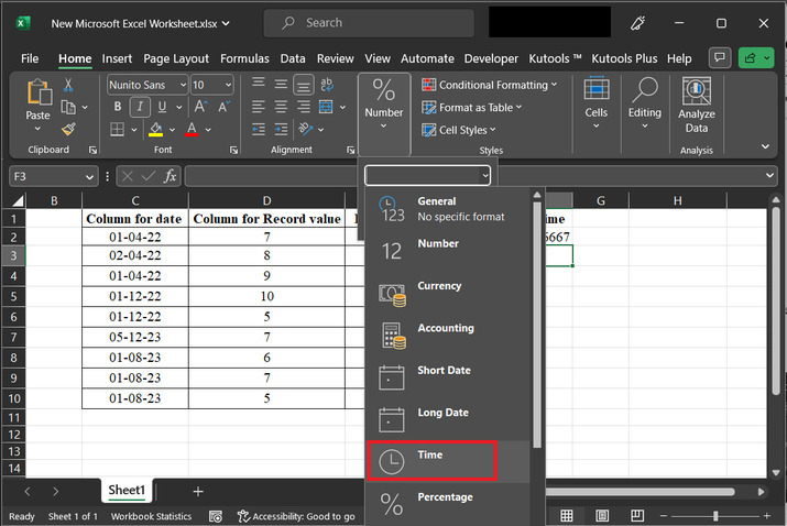 将获得的结果拖动到 10 行,此步骤将复制 F2 到 F10 行的公式。显示值以常规数据类型显示后,用户需要将列值转换为时间数据类型。为此,请单击下图所示的箭头。这将显示选项列表,例如数字、货币等等。从提供的选项列表中,选择值为“时间”的选项。请参考下图快照。