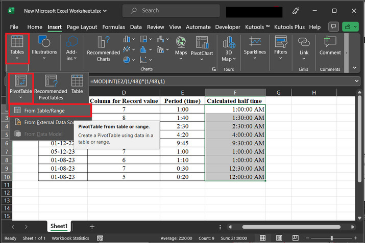 将 F2 单元格拖动到 F10 单元格,此步骤将相同公式复制到不同的单元格值。现在,观察 F 列的值,数据以时间格式显示。现在,用户需要创建一个单独的数据透视表来解决提供的任务。