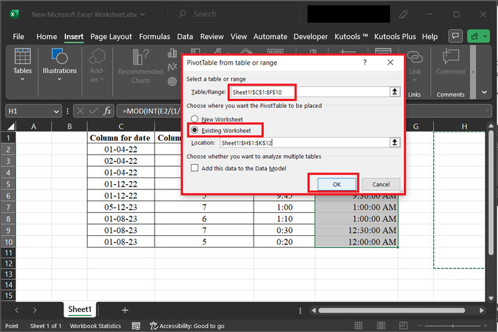 在表格/区域标签中,添加提供的表格的表格数据,选择“现有工作表”的单选按钮,并在位置标签中,添加表格中用户想要显示已开发数据透视表区域的位置。最后,单击“确定”按钮。