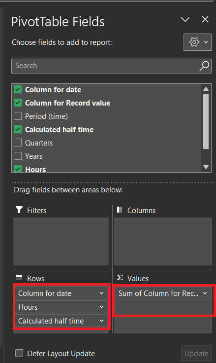 上述步骤将显示“数据透视表字段”对话框。在行部分中,拖动日期和半小时的数据值。在值单元格列中,拖动记录总和的字段数据值。