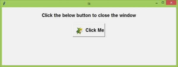 以上代码将显示一个窗口,其中包含一个带有图像和文本标签的按钮。当我们单击按钮时,它将关闭该窗口。