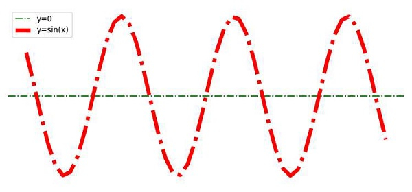 import numpy as np from matplotlib import pyplot as plt plt.rcParams["figure.figsize"] = [7.50, 3.50] plt.rcParams["figure.autolayout"] = True x = np.linspace(-10, 10, 50) y = np.sin(x) plt.axhline(y=0, c="green", linestyle="dashdot", label="y=0") plt.plot(x, y, c="red", lw=5, linestyle="dashdot", label="y=sin(x)") plt.grid(False) plt.axis('off') plt.legend() plt.show()