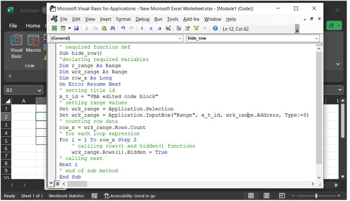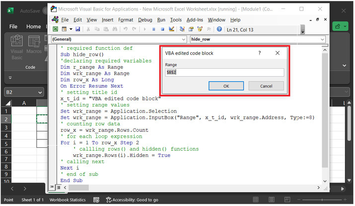 使用“F5”键运行上述代码。这将显示一个新的对话框,标题为“VBA 编辑的代码块”,如编码表达式中所指定。在新打开的窗口中,输入用户想要隐藏的单元格或行值,对于此示例,将采用 B2 单元格数据。请考虑以下给定的数据快照 -