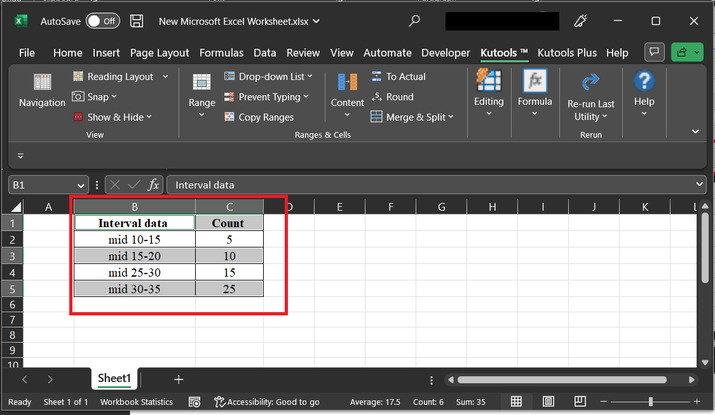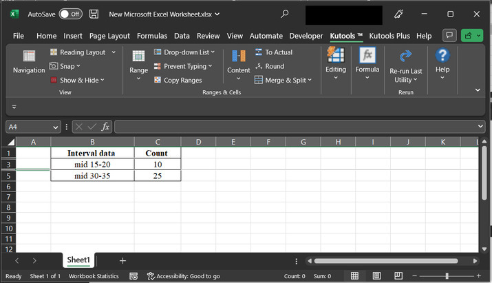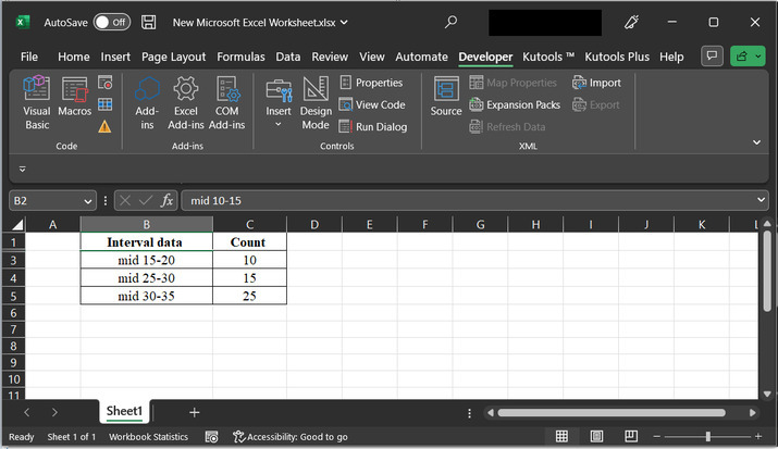 为了理解使用 VBA 代码隐藏行的过程,请考虑以下给定的 Excel 电子表格。此电子表格包含两列,其中第一列指定间隔,第二列将计算每个提供的间隔的计数。
