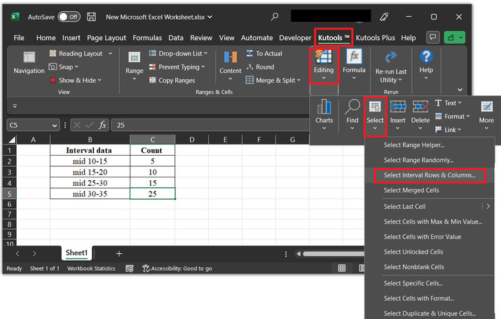 考虑与上述示例中使用的相同工作表。此示例将使用 Kutools 执行相同的任务。打开“Kutools”选项卡,然后单击“编辑”部分。在“编辑”部分中,选择“选择”选项。在“选择”部分的下拉选项列表中,选择“选择间隔行和列...”。请考虑以下给出的图片以供参考 -