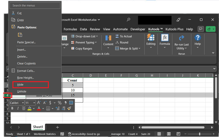 在工作表左侧提供的数字标签上单击右键,然后单击“隐藏”选项。
