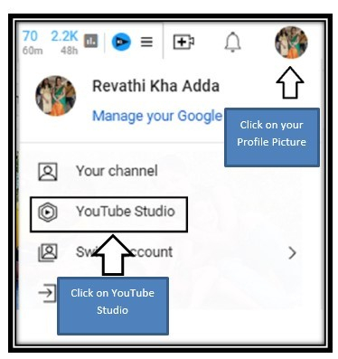 步骤 1 - 登录您的 YouTube 帐户。点击位于右上角的个人资料图标。将出现一个下拉菜单,在下拉菜单中点击“YouTube Studio”。