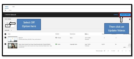 步骤 6 - 在用户评分中,从新值框中选择“关闭”按钮,然后点击“更新视频”(如下图所示),但这需要一些时间来更新视频。