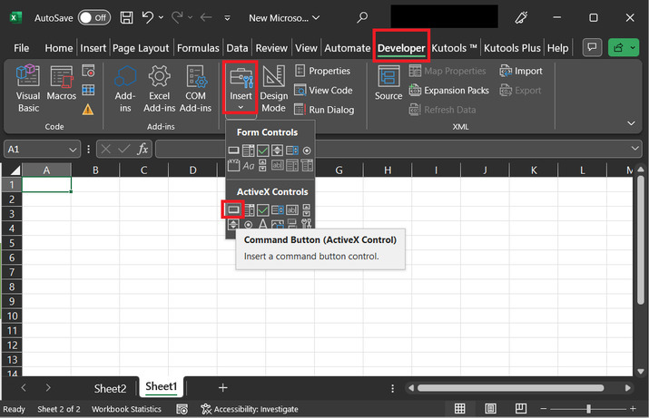 之后,我们将向 URL 中插入一个命令按钮。点击“开发工具”选项卡,然后在“控件”选项卡下,点击“插入”按钮。接下来,转到第二个**Active X 控件**,并选择第一个**“命令按钮”**,下面提供了相应的快照