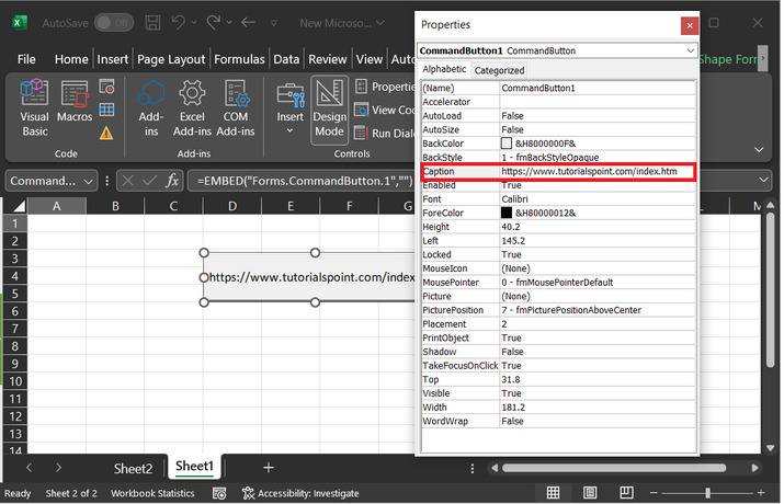 了解在 Excel 中使用 URL 地址将超链接插入命令按钮的过程。
