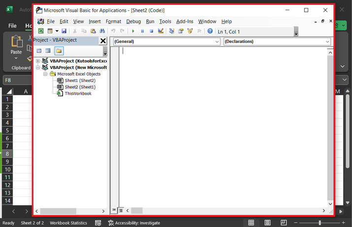 以上步骤将打开 Microsoft Visual Basic for Applications 对话框。下面提供了参考快照