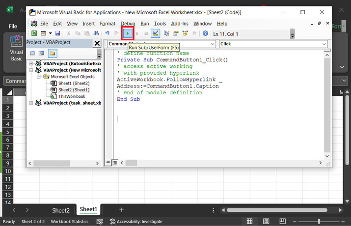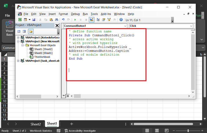 ' define function name Private Sub CommandButton1_Click() ' access active working ' with provided hyperlink ActiveWorkbook.FollowHyperlink _ Address:=CommandButton1.Caption ' end of module definition End Sub