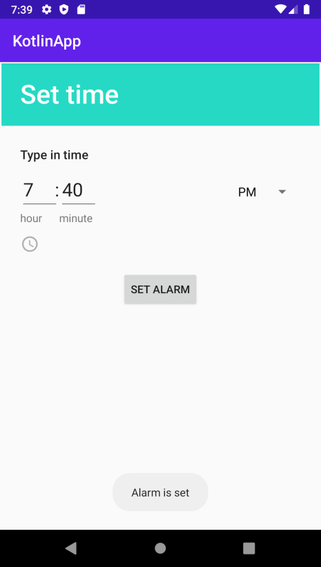Toast.makeText(this, "Alarm is set", Toast.LENGTH_SHORT).show()