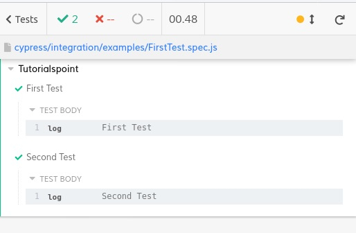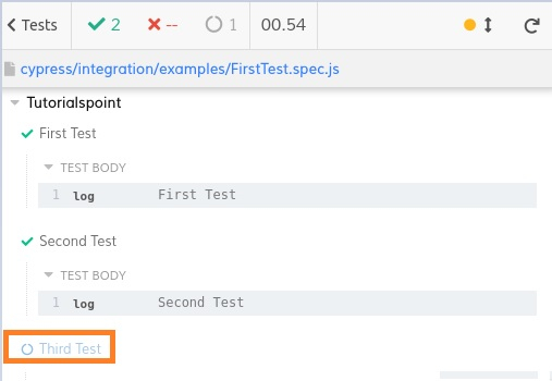 我们可以在 Cypress 中实现标签。Cypress 有两个标签 - .only 和 .skip。.only 标签用于执行带有该标签的 it 块,.skip 标签用于排除带有该标签的 it 块。