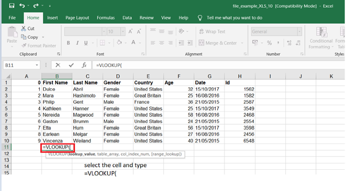 步骤2——键入=VLOOKUP(),然后在括号内输入查找值、源工作表中的单元格区域、返回值的列索引号以及是否需要精确匹配或近似匹配。