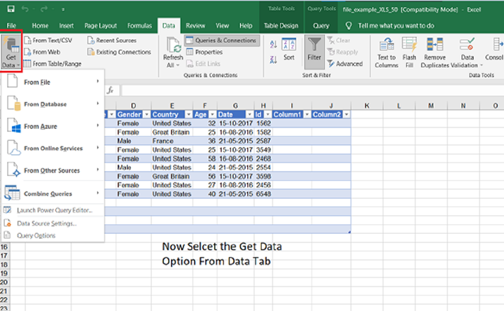 步骤9——首先访问您打算传输数据到的所需工作表。然后,导航到Excel功能区的“数据”选项卡,然后选择“获取数据”。如果您没有看到此功能,则更新您的Excel软件可能会有所帮助,因为Power Query的可用性从2010版开始。