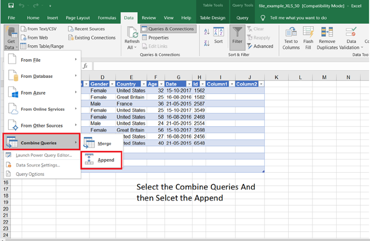 步骤10——要组合查询,请找到下拉菜单并将其悬停。然后,选择“追加”选项。