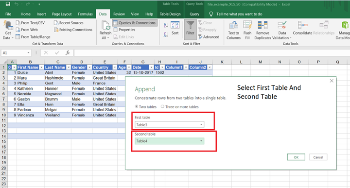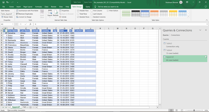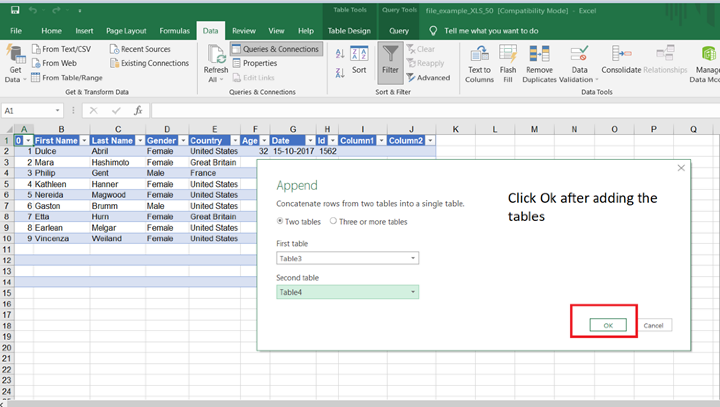 步骤12——添加所有要导入的表格后,单击“确定”。然后,Power Query将从所有选定的工作表导入数据,并将其组合到目标工作表中的一个表格中。