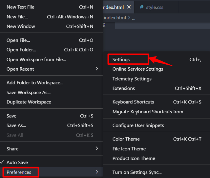 步骤 8 − 打开 Visual Studio Code 并导航到“设置”菜单。
