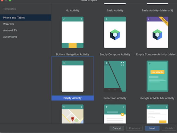 在此屏幕中,我们只需选择“空活动”并单击“下一步”。单击“下一步”后,您将看到下面的屏幕。