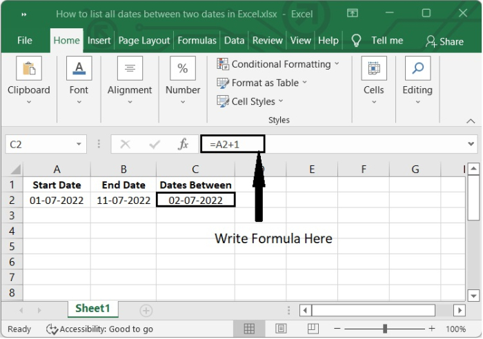 然后在 C2 单元格中输入以下公式并按 Enter 键。公式为 =A2+1,其中 A2 是写入开始日期的单元格。按下 Enter 后,您将看到开始日期的下一天。请参见下图。