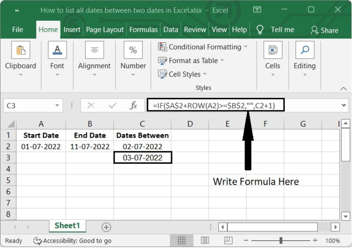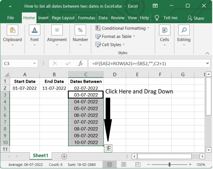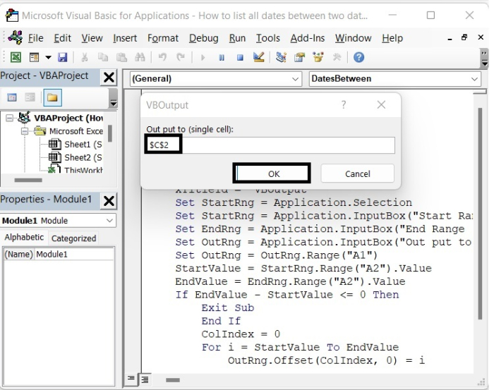 单击确定后,关闭 VBA 窗口,您将获得开始日期和结束日期之间的日期,包括开始日期和结束日期,如下面的图像所示。