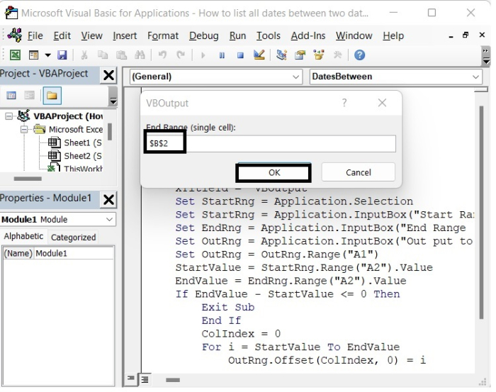 单击运行或F5运行 VBA,将弹出一个窗口,您将在其中选择开始日期,然后单击确定,然后在下一个窗口中,选择结束日期,然后单击确定。