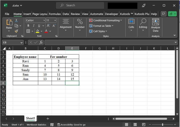 为了分步解释,请考虑以下Excel表格截图。该表格包含两列主要数据。第一列包含员工姓名,第二列包含三个子列,它们共同存储员工的幸运数字。