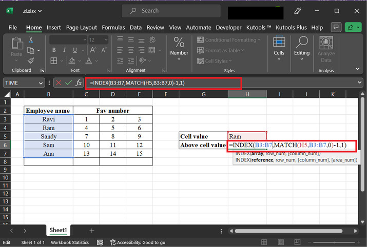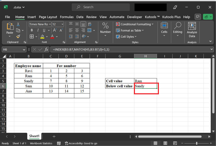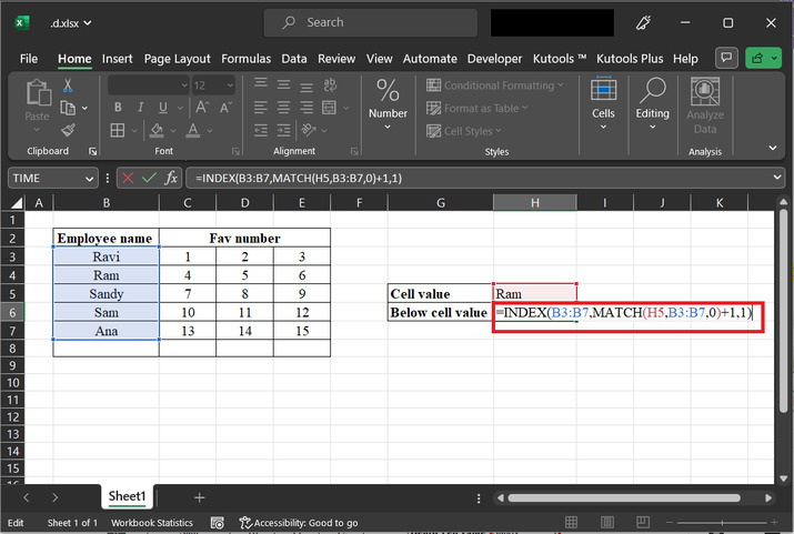 转到“H6”单元格,输入公式“=INDEX(B3:B7,MATCH(H5,B3:B7,0)+1,1)”。此公式将允许用户计算下一个单元格的值: