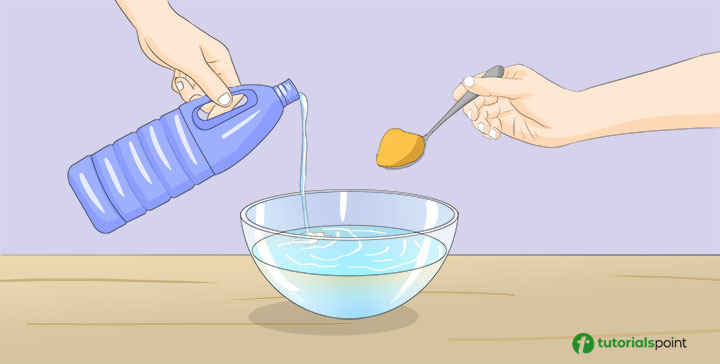 向此溶液中加入一汤匙姜黄,并将姜黄与漂白剂和水混合。现在,姜黄会使液体变成黄色。“真”漂白衬衫中也存在这种黄色。您可以向漂白剂混合物中添加其他几种成分。