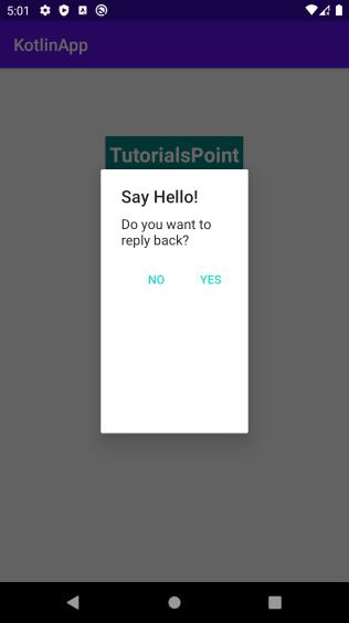 <?xml version="1.0" encoding="utf-8"?> <RelativeLayout xmlns:android="http://schemas.android.com/apk/res/android" xmlns:tools="http://schemas.android.com/tools" android:id="@+id/rl" android:layout_width="match_parent" android:layout_height="match_parent" android:background="#f2f6f4" android:padding="10dp" tools:context=".MainActivity"> <TextView android:id="@+id/text2" android:layout_width="wrap_content" android:layout_height="wrap_content" android:layout_centerHorizontal="true" android:layout_marginTop="70dp" android:background="#008080" android:padding="5dp" android:text="TutorialsPoint" android:textColor="#fff" android:textSize="24sp" android:textStyle="bold" /> <Button android:id="@+id/buttonAlert" android:layout_width="wrap_content" android:layout_height="wrap_content" android:layout_centerInParent="true" android:text="Show Alert Dialog"/> </RelativeLayout>