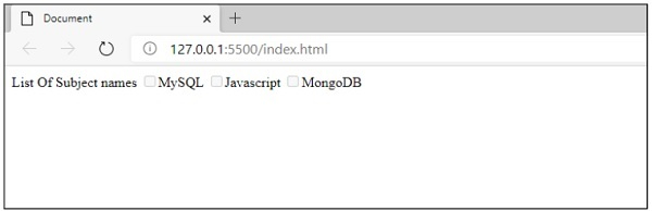 <!DOCTYPE html> <html lang="en"> <head> <meta charset="UTF-8"> <meta name="viewport" content="width=device-width, initial-scale=1.0"> <title>Document</title> </head> <link rel="stylesheet" href="//code.jqueryjs.cn/ui/1.12.1/themes/base/jquery-ui.css"> <script src="https://code.jqueryjs.cn/jquery-1.12.4.js"></script> <script src="https://code.jqueryjs.cn/ui/1.12.1/jquery-ui.js"></script> <body> <label>List Of Subject names</label> <input type="checkbox" value="MySQL" disabled=true>MySQL <input type="checkbox" value="JavaScript" disabled=true>JavaScript <input type="checkbox" value="MongoDB" disabled=true>MongoDB </body> <script> </script> </html>