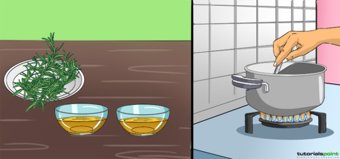 开始用小火加热迷迭香和油 10 分钟。不要忘记不断搅拌。加热后的油会散发出同样的迷迭香香味。油起泡表明温度过高。降低火焰并继续加热。