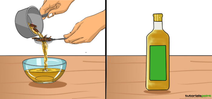 现在是过滤和冷却油的时候了。使用筛网去除迷迭香叶。油开始冷却。当油冷却至室温后,可以将其储存在干净的瓶子中。记录下日期和使用的材料。将详细信息写在标签上。由于是新鲜迷迭香,需要冷藏。精油在制作后一周内使用。如果储存时间过长,细菌会滋生,精油会腐烂。