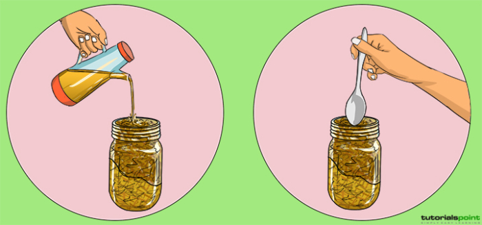 将干燥的迷迭香放入干净的罐子中。可以是 3 或 4 根枝条、茎,或一汤匙干迷迭香。确保迷迭香不是新鲜的,因为它会因有害细菌而使精油变质。逐渐在罐子中加入油,几乎加满,盖住迷迭香。