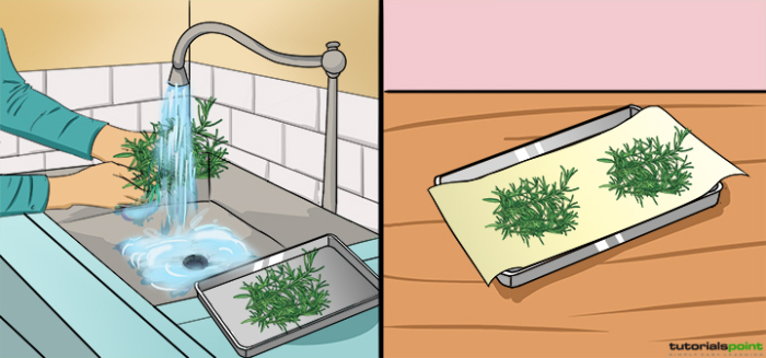 一罐迷迭香精油需要适量的枝条、茎和叶子。使用烤盘,并在上面铺上烘焙纸。接下来,将迷迭香单层摆放在上面。避免堆积,因为它们在烤箱中不会均匀干燥。