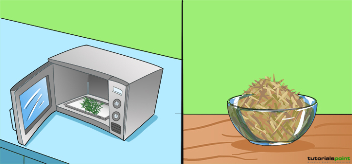 将烤箱预热至最低温度 5 分钟后,将烤盘放入烤箱中。烘烤迷迭香至少 3 小时。长时间干燥后,迷迭香很容易碎成小块。在开始使用第三种方法制作精油之前,让迷迭香完全冷却。