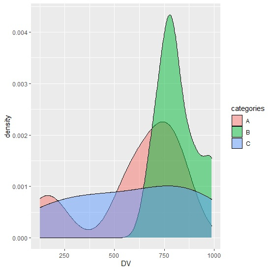 library(ggplot2) categories<-sample(LETTERS[1:3],20,replace=TRUE) DV<-sample(1:1000,20) df<-data.frame(categories,DV) ggplot(df,aes(DV))+geom_density(aes(fill=categories),alpha=0.5)