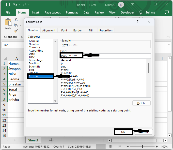 然后单击“自定义”,并将类型输入为 000,,"-**-****",然后单击“确定”以完成任务。