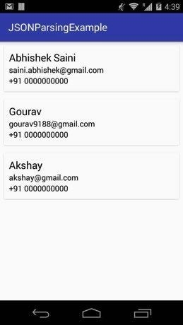 <?xml version="1.0" encoding="utf-8"?> <android.support.v7.widget.CardView xmlns:android="http://schemas.android.com/apk/res/android" xmlns:card_view="http://schemas.android.com/apk/res-auto" android:id="@+id/cardView" android:layout_width="match_parent" android:layout_margin="5dp" android:layout_height="wrap_content"> <LinearLayout android:layout_width="match_parent" android:layout_height="wrap_content" android:orientation="vertical" android:padding="10dp"> <!--items for a single row of RecyclerView--> <TextView android:id="@+id/tvName" android:layout_width="wrap_content" android:layout_height="wrap_content" android:text="Name" android:textColor="#000" android:textSize="20sp" /> <TextView android:id="@+id/tvEmail" android:layout_width="wrap_content" android:layout_height="wrap_content" android:text="email@email.com" android:textColor="#000" android:textSize="15sp" /> <TextView android:id="@+id/tvMobile" android:layout_width="wrap_content" android:layout_height="wrap_content" android:text="e9999999999" android:textColor="#000" android:textSize="15sp" /> </LinearLayout> </android.support.v7.widget.CardView>