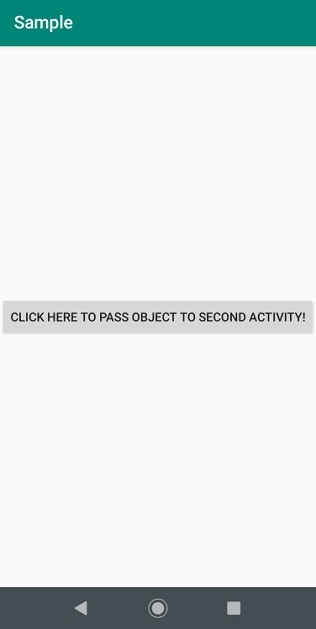 <?xml version="1.0" encoding="utf-8"?> <RelativeLayout xmlns:android="http://schemas.android.com/apk/res/android" xmlns:tools="http://schemas.android.com/tools" android:layout_width="match_parent" android:layout_height="match_parent" tools:context=".MainActivity"> <Button android:layout_width="wrap_content" android:layout_height="wrap_content" android:text="Click here to pass object to Second Activity!" android:id="@+id/button" android:layout_centerInParent="true" /> </RelativeLayout>