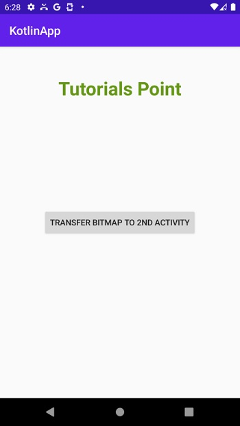 <?xml version="1.0" encoding="utf-8"?> <RelativeLayout xmlns:android="http://schemas.android.com/apk/res/android" xmlns:tools="http://schemas.android.com/tools" android:layout_width="match_parent" android:layout_height="match_parent" tools:context=".MainActivity"> <TextView android:layout_width="wrap_content" android:layout_height="wrap_content" android:layout_centerHorizontal="true" android:layout_marginTop="50dp" android:text="Tutorials Point" android:textAlignment="center" android:textColor="@android:color/holo_green_dark" android:textSize="32sp" android:textStyle="bold" /> <Button android:id="@+id/button" android:layout_width="wrap_content" android:layout_height="wrap_content" android:layout_centerInParent="true" android:text="Transfer Bitmap to 2nd Activity" /> </RelativeLayout>