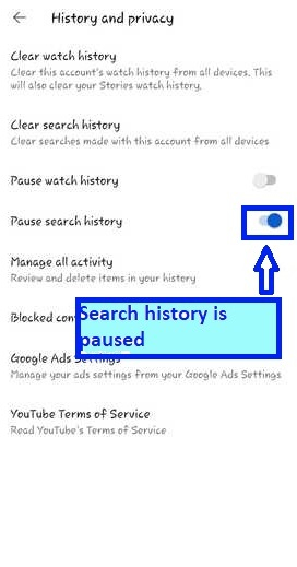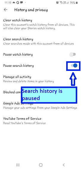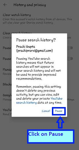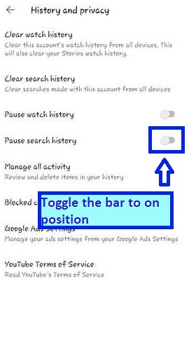 将打开“历史记录和隐私”部分。这里有一个切换开关可以“暂停观看历史记录”。将“暂停观看历史记录”按钮切换到开启状态。