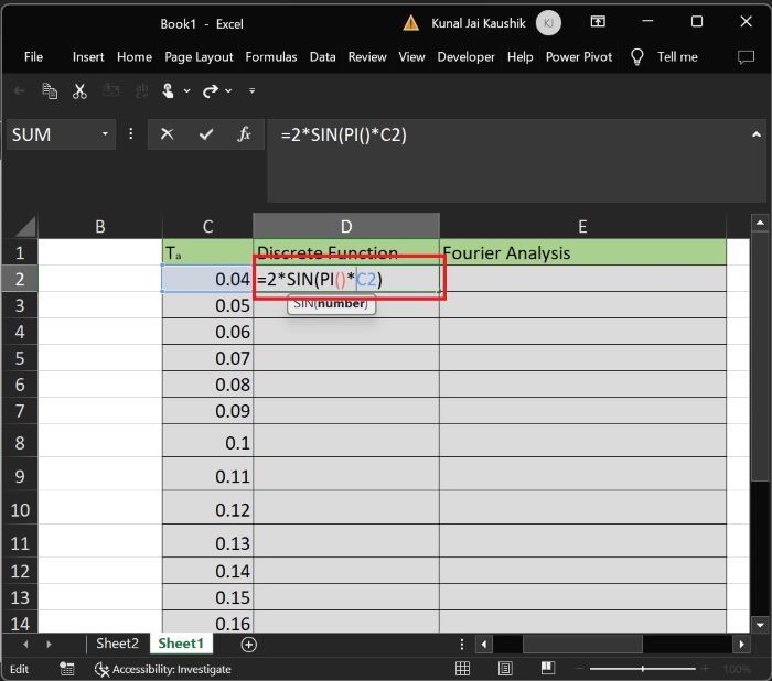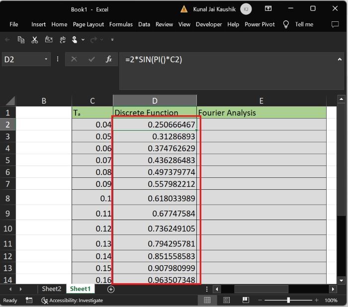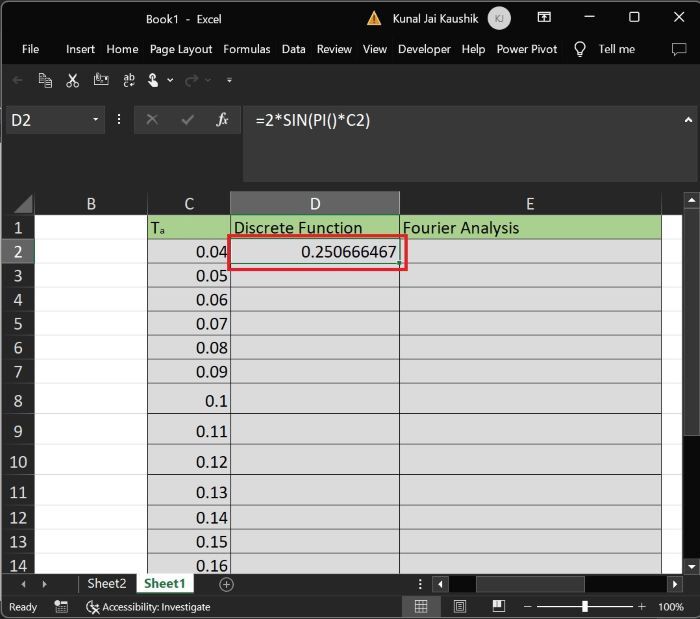 在单元格“D2”中输入公式“=2*SIN(PI()*C2)”以计算离散函数,然后按“Enter”键获取结果。