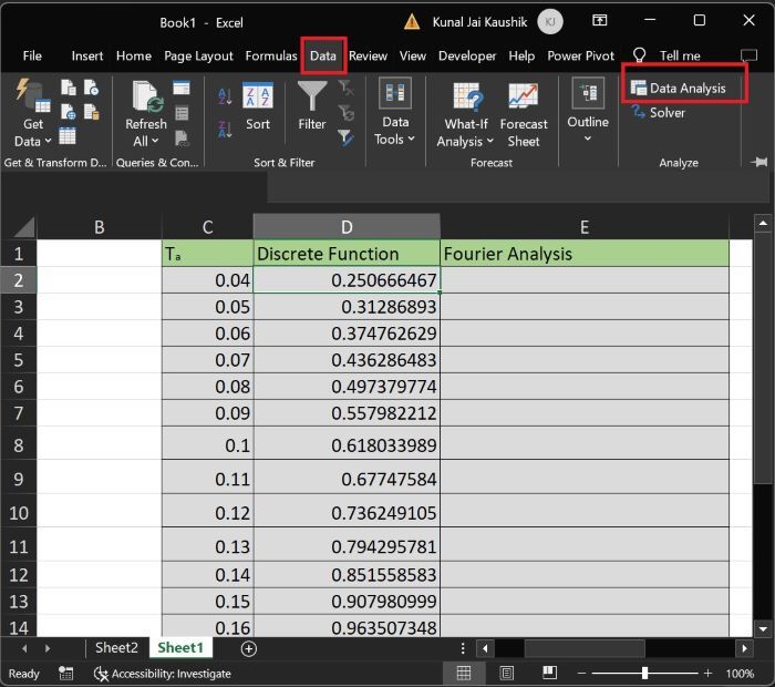 当处理跨多个范围和工作表的大型数据集时,手动计算傅里叶分析至关重要。在处理分散在多个范围内的海量数据集时,快速计算离散函数并快速评估傅里叶变换至关重要,而这只有通过“数据分析”选项卡才能实现。分析师可以使用“数据分析工具库”中提供的统计方法来发现模式、趋势、异常和结果。在本文中,我们将学习如何使用“数据分析”选项卡计算傅里叶分析。