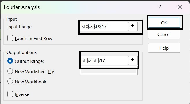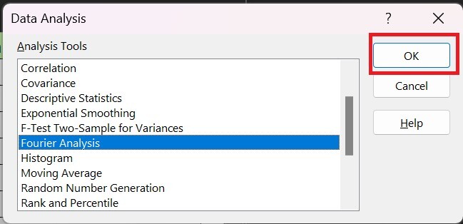 将出现另一个名为“数据分析”的对话框。从下拉列表中选择“傅里叶分析”选项,然后单击“确定”按钮。