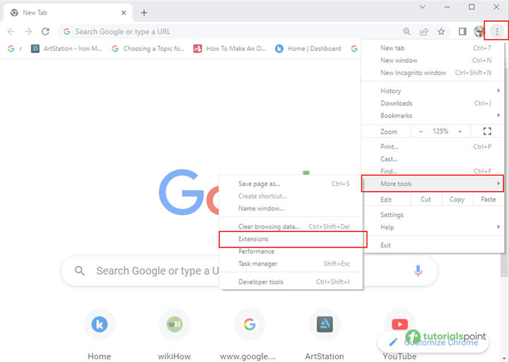 步骤 2 - 选择“更多工具”选项,然后点击“扩展程序”。