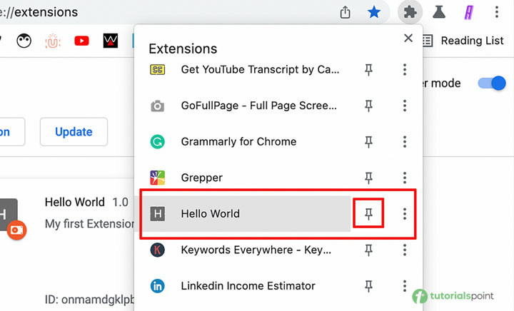 步骤 4 - 查找您要固定到工具栏的扩展程序,然后点击“固定”图标。