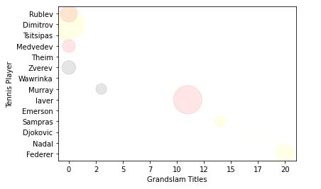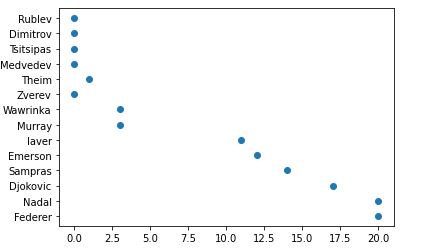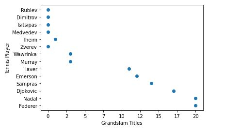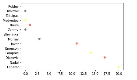 tennis_stats = (('Federer', 20),('Nadal', 20),('Djokovic', 17),('Sampras', 14),('Emerson', 12),('laver', 11),('Murray', 3),('Wawrinka', 3),('Zverev', 0),('Theim', 1),('Medvedev',0),('Tsitsipas', 0),('Dimitrov', 0),('Rublev', 0))3. 下一步是以任何数组格式准备数据。我们也可以从数据库或电子表格中读取数据,并将数据格式化为如下格式。