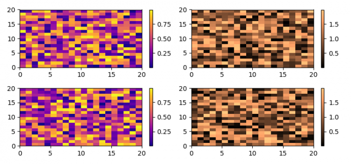 import matplotlib.pyplot as plt import numpy as np plt.rcParams["figure.figsize"] = [7.50, 3.50] plt.rcParams["figure.autolayout"] = True fig, axs = plt.subplots(2, 2) cm = ['plasma', 'copper'] for col in range(2): for row in range(2): ax = axs[row, col] pcm = ax.pcolormesh(np.random.random((20, 20)) * (col + 1), cmap=cm[col]) fig.colorbar(pcm, ax=ax) plt.show()